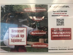 During class, my English teacher brought this image to my attention. It is essentially a poster that emphasizes that SCU students speak against sexual violence, bias, harassment and discrimination. This is because (as the poster puts it) SCU works to build a culture of care.