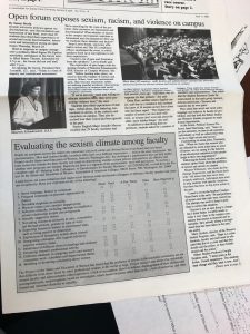Archival research was one of the most useful practices in constructing my researched argument. The items I found there influenced my entire essay and created support for my thesis. One source that I found was extremely interesting. It was entitled “Open forum exposes sexism, racism, and violence on campus”. In small text the front page indicated that this was a newspaper for Santa Clara University faculty and staff, so it can be assumed that the general public did not have access to it. Throughout the article there were accounts from students about being sexually assaulted, receiving racist and sexist jokes from faculty and generally feeling uncomfortable in the social climate of Santa Clara.