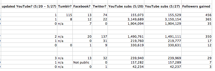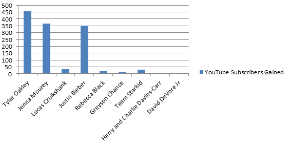 Overall, Tyler Oakley, Jenna Mourey, and Justin Bieber gained the most YouTube subscribers in the time that I observed their channels. Looking back at the social network usage charts, it seems that they are among the most active across the most platforms. They were also examples of channels who came out with a single popular video to greatly increase their subscriber numbers. Even though they only updated their YouTube channel once in the week that I observed them, their constant posts on social networks still drove fans to subscribe to their channels.