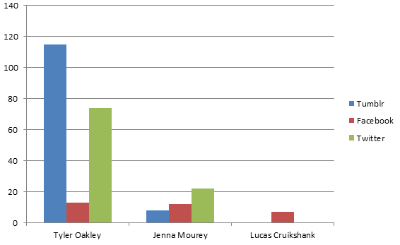 From this we can see that Tyler Oakley was the most active blogger in terms of social network usage. He and Jenna Mourey both used all three social networks to promote their video channel. On the other hand, Lucas Cruikshank only used Facebook to promote his channel. He did not even have a Tumblr account and had not updated his Twitter in the week that I observed his social network usage.