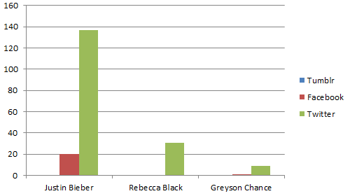 From this we can see that Justin Bieber was the most active on social networks, especially Twitter. This seemed to be the case with all of the musicians as they all updated Twitter at least once a day in the week that I observed. It is interesting to note that none of the three musicians had Tumblr accounts to promote their YouTube channels.