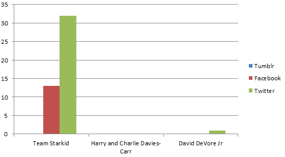 Here, we see that Team Starkid far outweighed the two other Viral Video channels in social network usage. Their strong online presence in Facebook and Twitter kept them much more active on fan’s online news feeds than the other two channels I observed. Like the musicians, none of the three viral video channels used Tumblr for promotion.