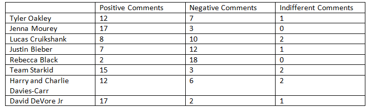 From this we can see that the most positive popularity was observed with Jenna Mourey and David De Vore Jr. Jenna Mourey causes controversy with her videos, but gains a large audience by making her videos comical, applicable to a young fan base, and regularly updated. The most popular video on David De Vore Jr.’s channel, “David After the Dentist,” is one of the most viewed videos of all time on YouTube. It is an example of a viral video because it gained a large number of views through word-of-mouth, so to speak. This word-of-mouth comes from social media usage of fans who email or tweet links to the video.