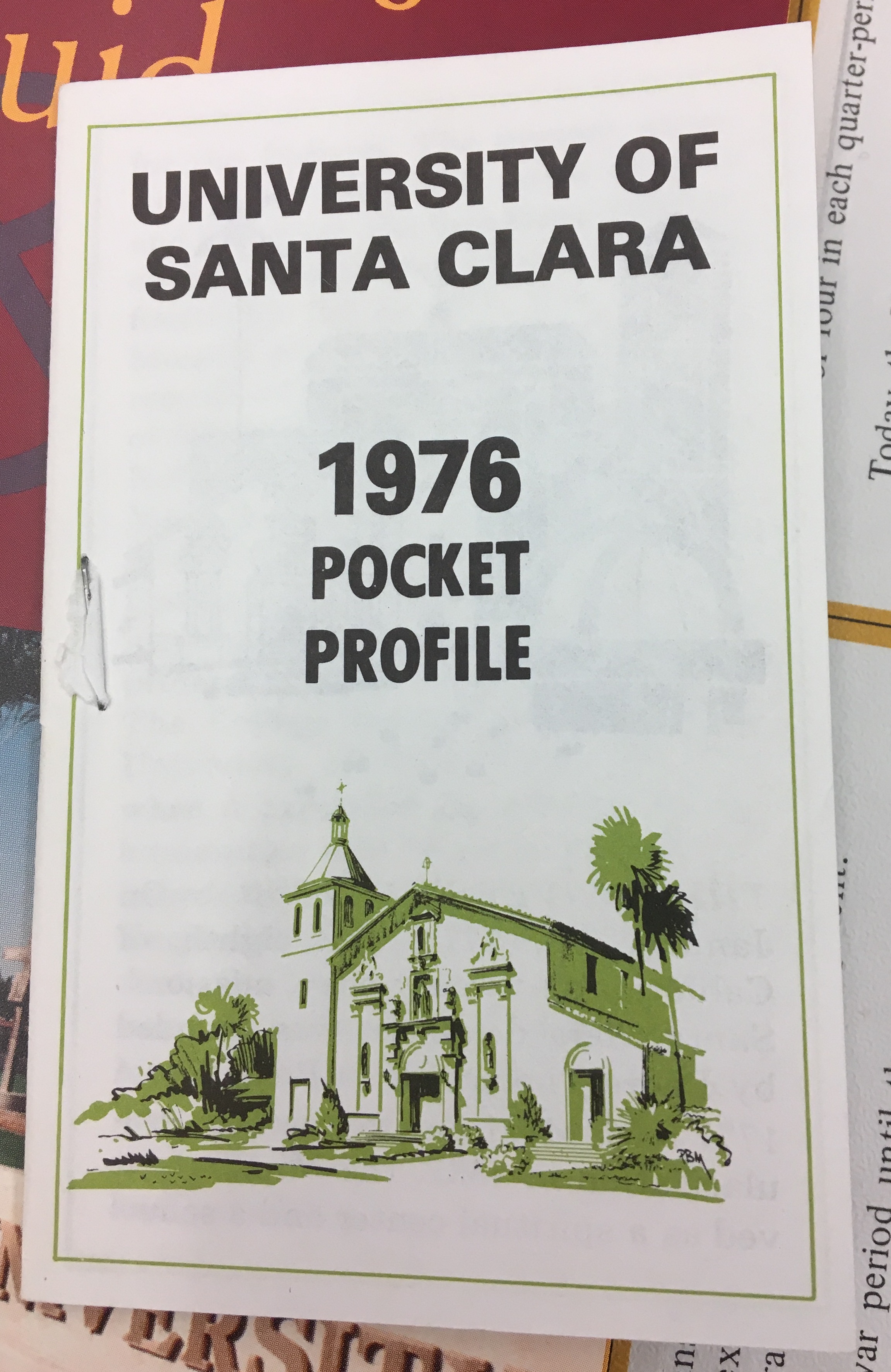 I opened a folder entitled “University of Santa Clara Visitors Guide” and, among dozens of brochures and pamphlets designed to handout to prospective students and their families, found a cute little book called “University of Santa Clara 1976 Pocket Profile.”