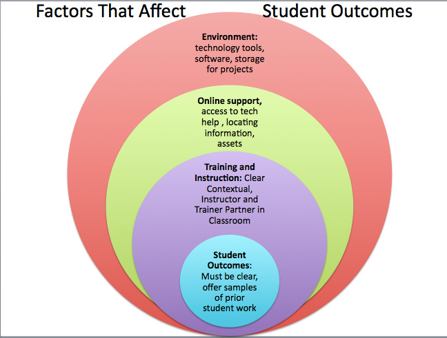 Multimedia software is taught contextually (reflects the course and assignment) and is taught in the order they will use it -where the workshop addresses all software functions they need to use, soft skills, such as video techniques, camera angles, lighting, sets, audio, editing, etc.