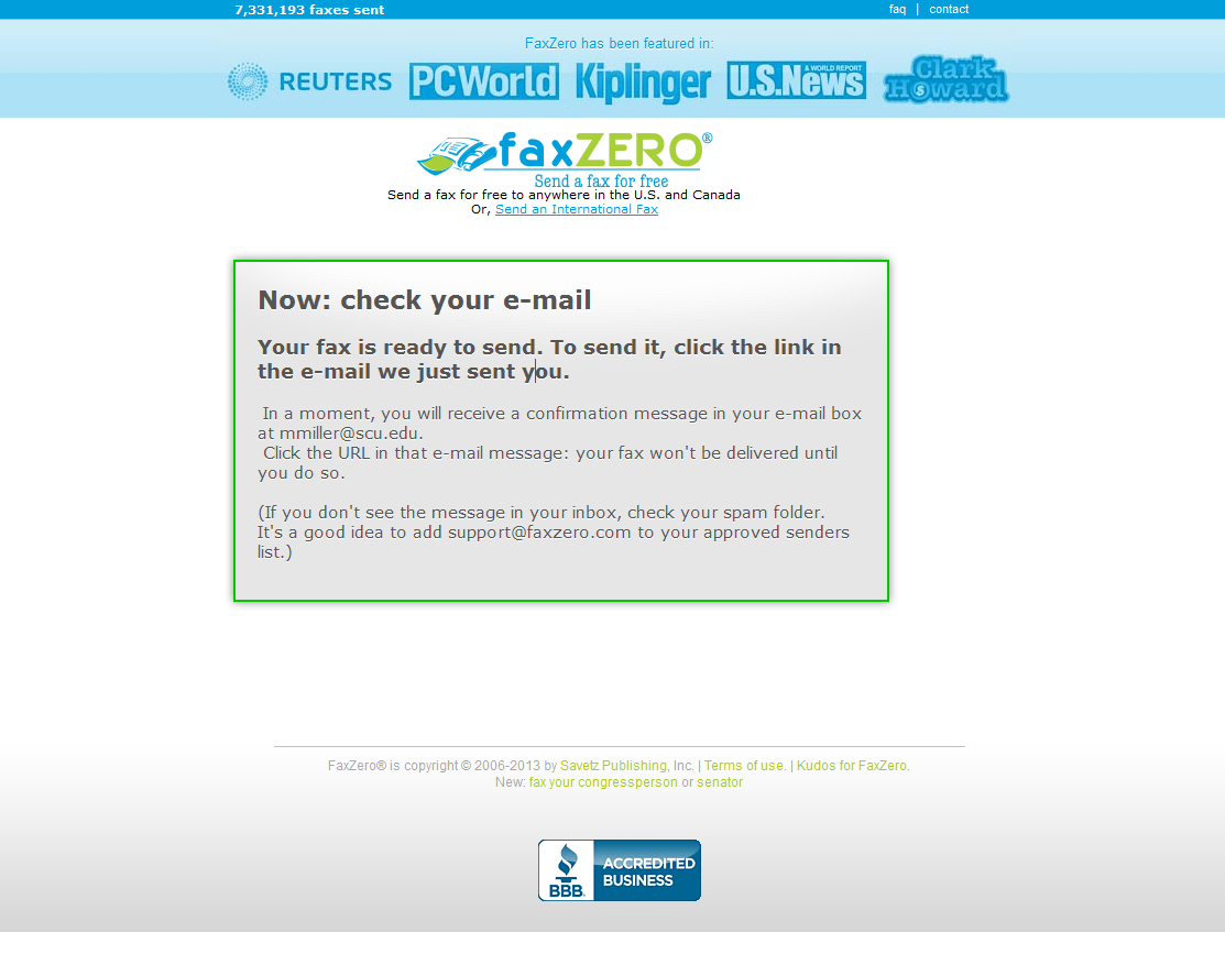 3. Click Send Free Fax Now to send. It should redirect you to a page similar to this: