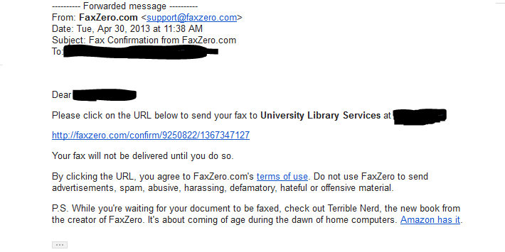 4. Continue to the email you entered, and inside your email there should be a message from Faxzero.com that looks like this:
